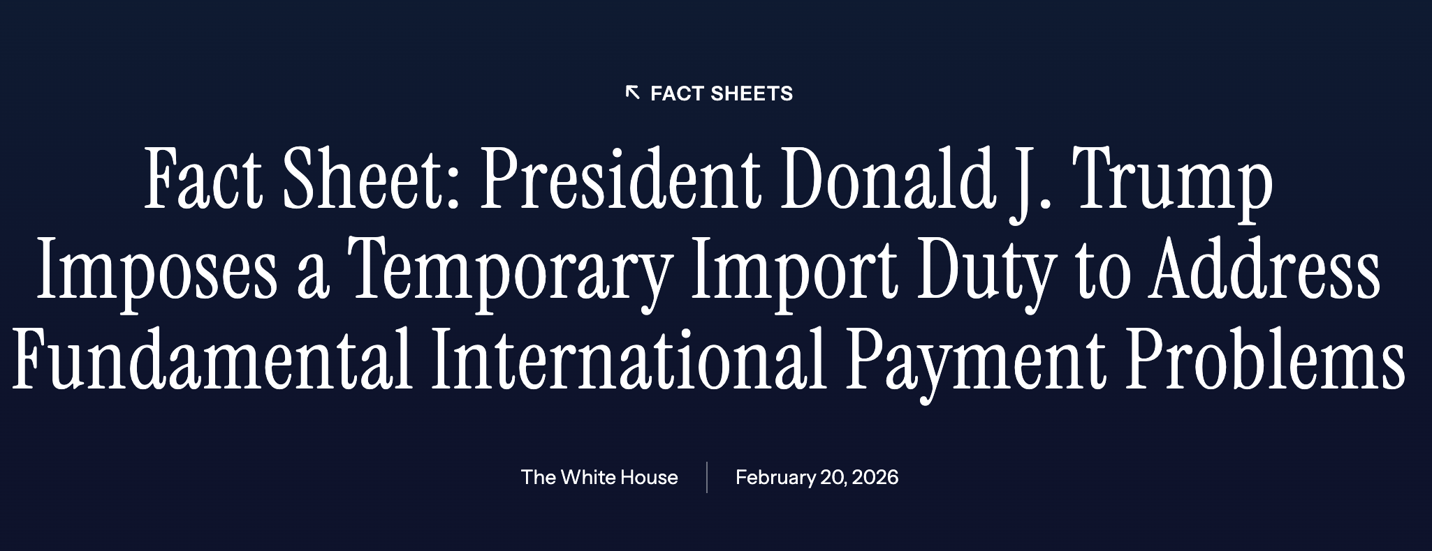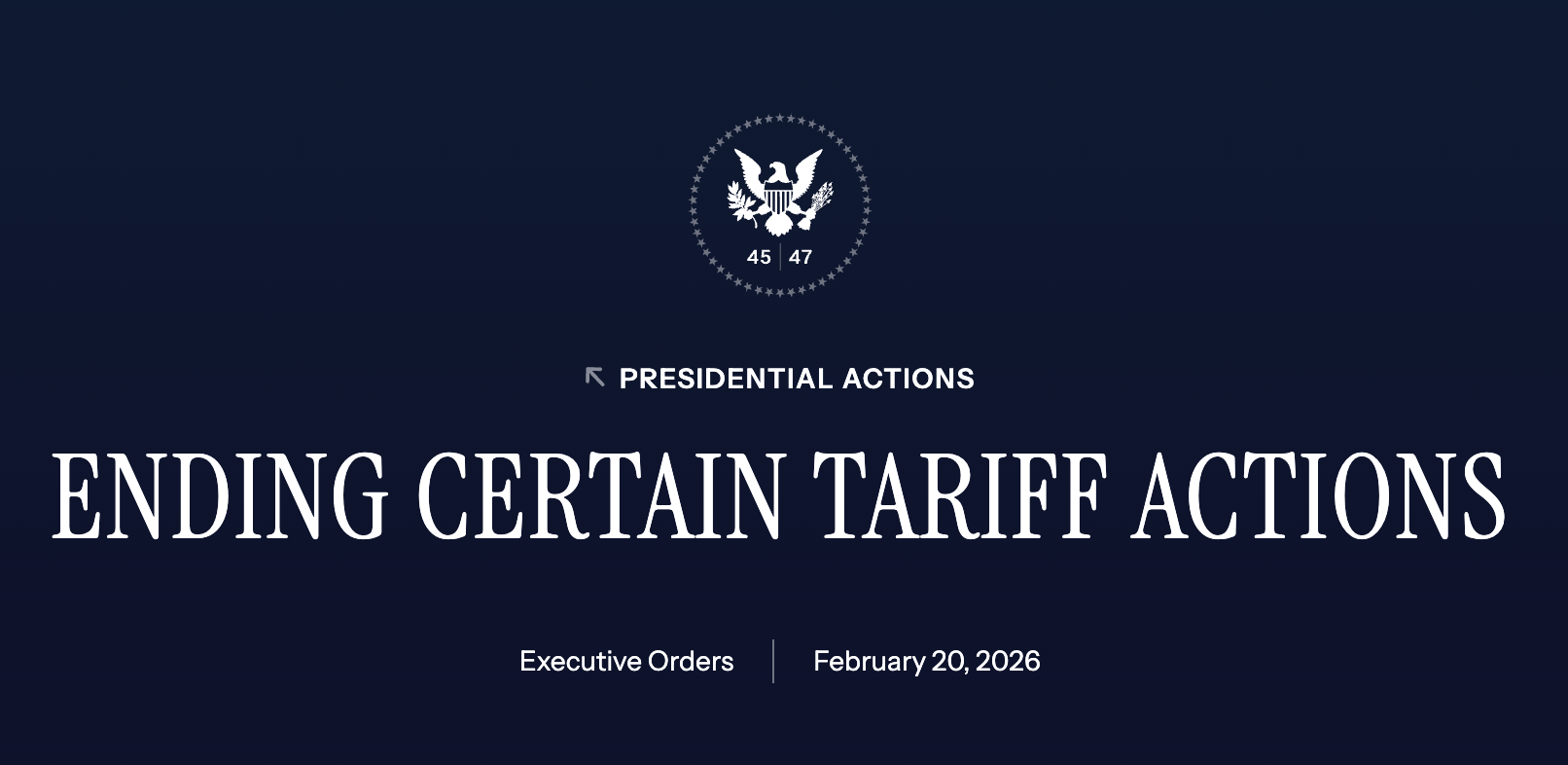 白宫官网发布两项特朗普签署的行政令,一项确认政府原先援引IEEPA推动的相关关税将被“终止”,另一项确认在未来150天内对全球输美商品加征10%的关税,同时启动“301调查”。