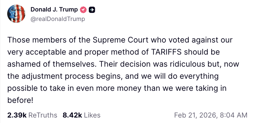 特朗普还在社交媒体上连续发文抨击裁决:“那些投票反对我们完全合理且恰当的关税制度的最高法院法官们应该感到羞耻。他们的决定荒谬至极,但现在调整程序已经开始,我们将竭尽全力争取比以前更多的收入!”